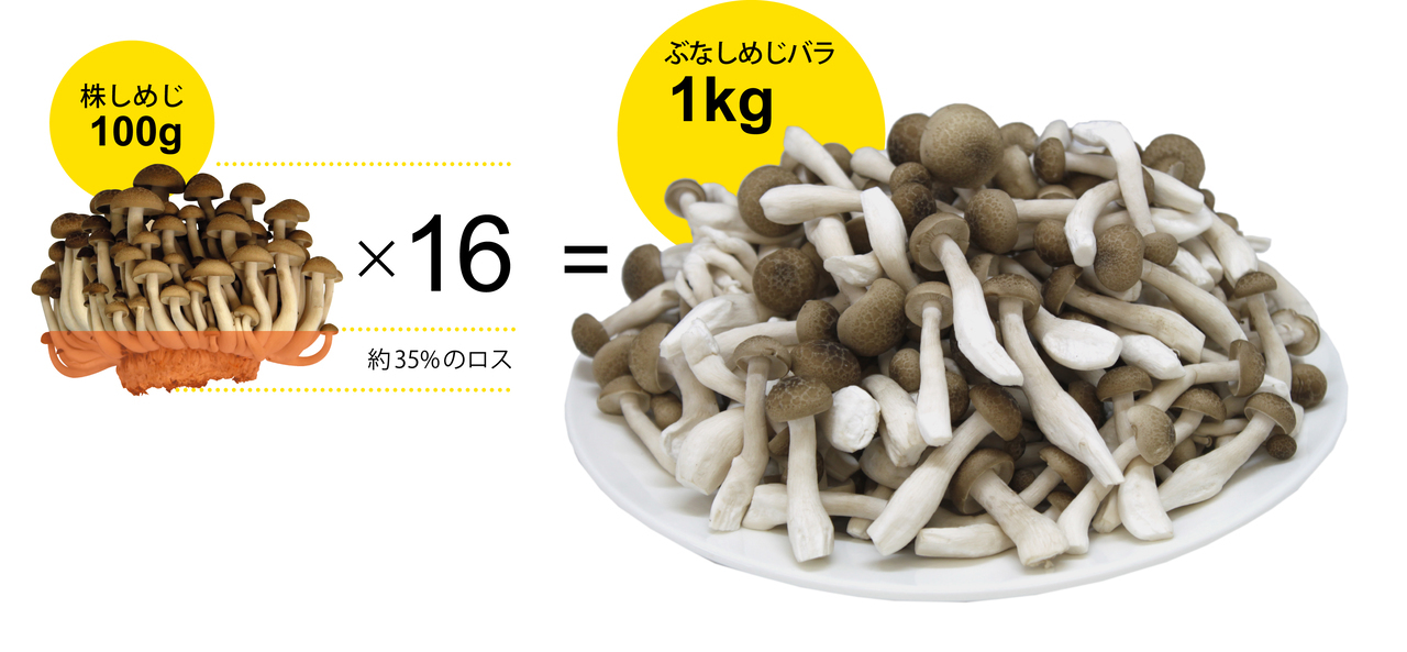 株状態のキノコから可食部のみを切りると約35%~45%の廃棄物が出ます。食品残渣の処理費用は1kg当り約30円の費用が必要になるので、カットキノコを1kg仕入れると約18円のごみ処理コストが削減できます。