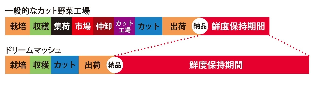 ドリームマッシュの業務用キノコは、生産者直接加工による流通経路の簡素化により鮮度保持期間が長く保てます。輸送トラックによる複数回の積み下ろしは、きのこへのストレス多くなり、カット後の鮮度保持期間そのものが短くなってしまいます。