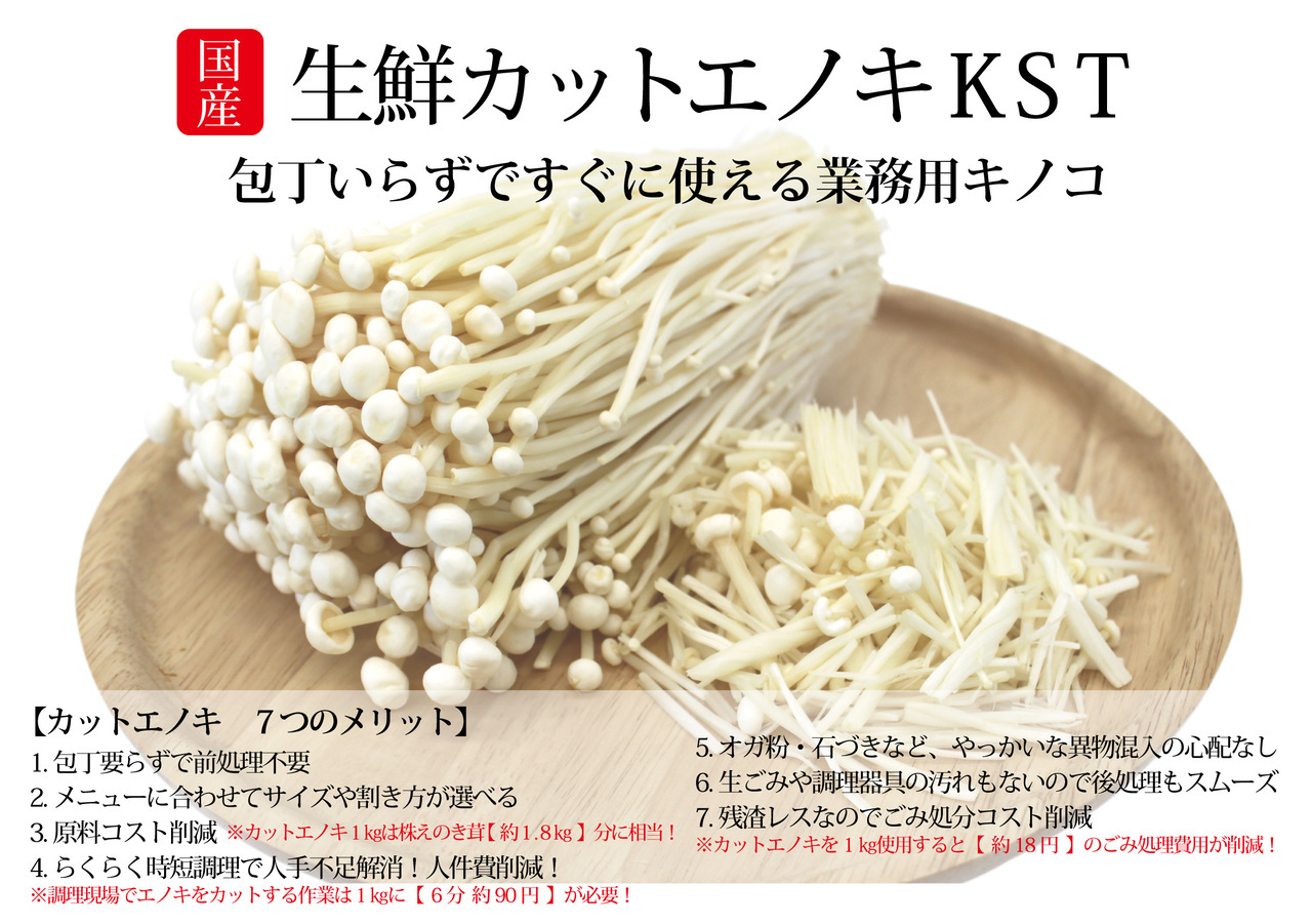 カットエノキKST高度な知識と専門技術を持ち合わせた専任オペレーターのみが生産します。調子現場で問題となりやすい、異物混入や鮮度不良が改善できます。